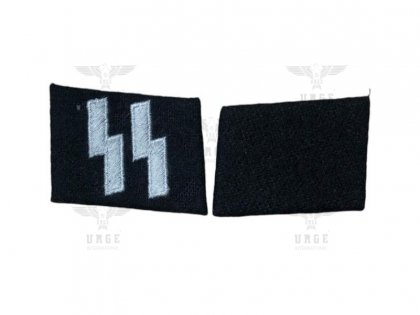 These tabs feature the SS rune on one side, with the opposite side denoting rank through the absence of stripes and pips, symbolizing the rank of Private/EM. The design is elegantly backed by a rich black woolen fabric, enhancing their overall sophistication and visual appeal.