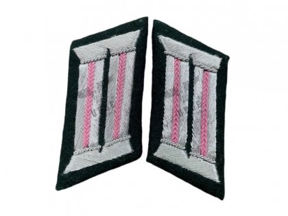 Showcase your collection with these striking collar tabs, piped in vibrant pink to represent the Panzertruppen. Hand embroidered with luxurious silver bullion cord on a stiffened bottle green wool backing, these tabs are not only authentic but also versatile, worn by officers in Armoured Reconnaissance and Anti-Tank units. A perfect tribute to elite armored forces.